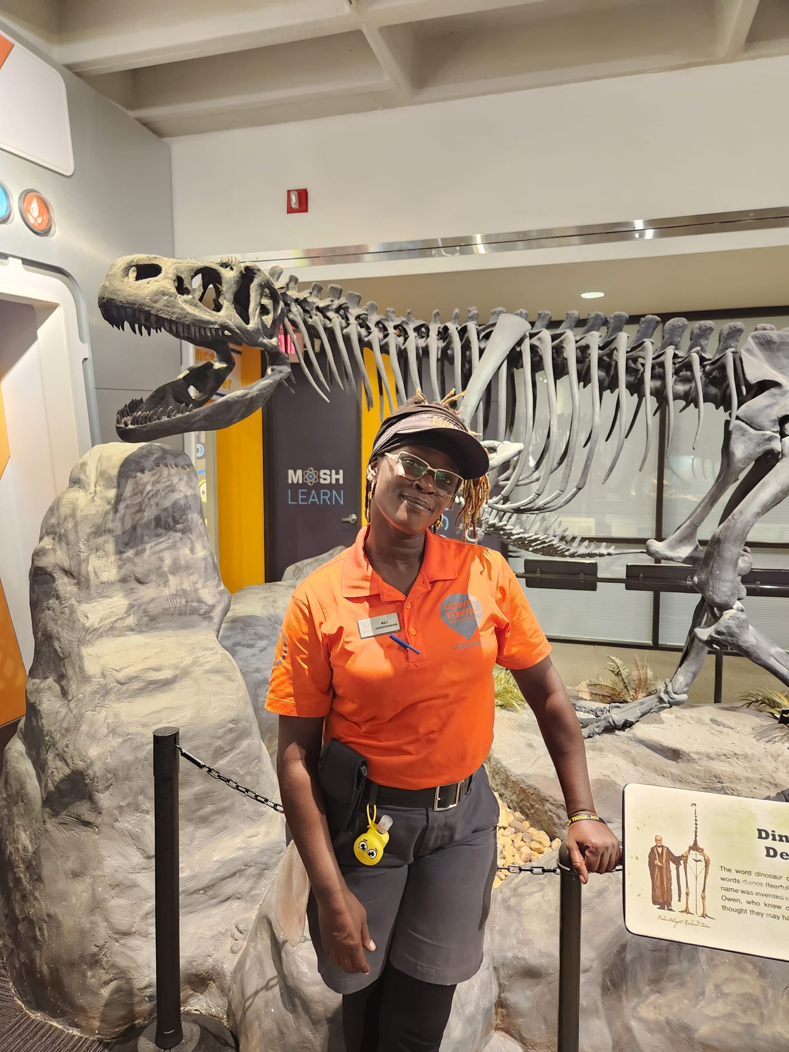 A DVI Ambassador smiles in front of a dinosaur skeleton during a sponsored trip to the Museum of Science and History.